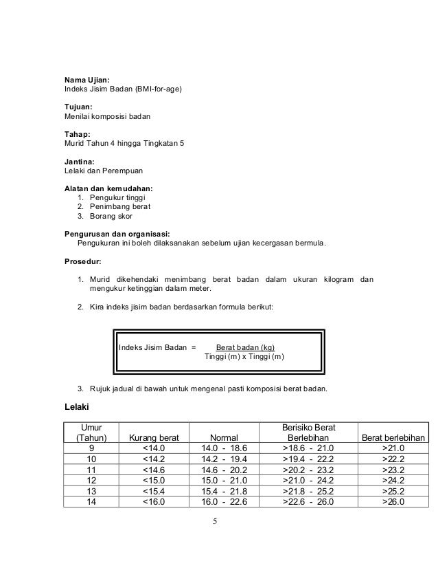 PENDIDIKAN JASMANI PRA SEGAK TINGGI BERAT BMI STATUS 152 51 221 NORMAL PASCA SEGAK TINGGI BERAT BMI STATUS JADUAL PENGIRAAN BMI Perempuan Umur Tahun Kurang Berat Normal Berisiko Berat Berlebihan Berat. 3Kawasan ujian mesti selamat dan sesuai dengan jenis ujian yang hendak dijalankan. Ujian dilaksanakan secara berpasangan.